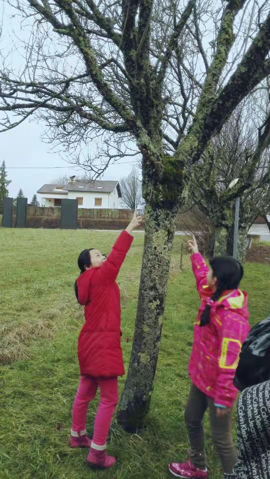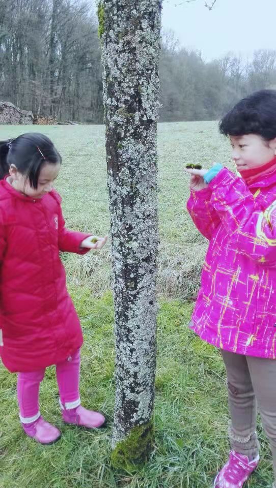两个姑娘,仔仔细细地研究了树上扒下来的苔藓。