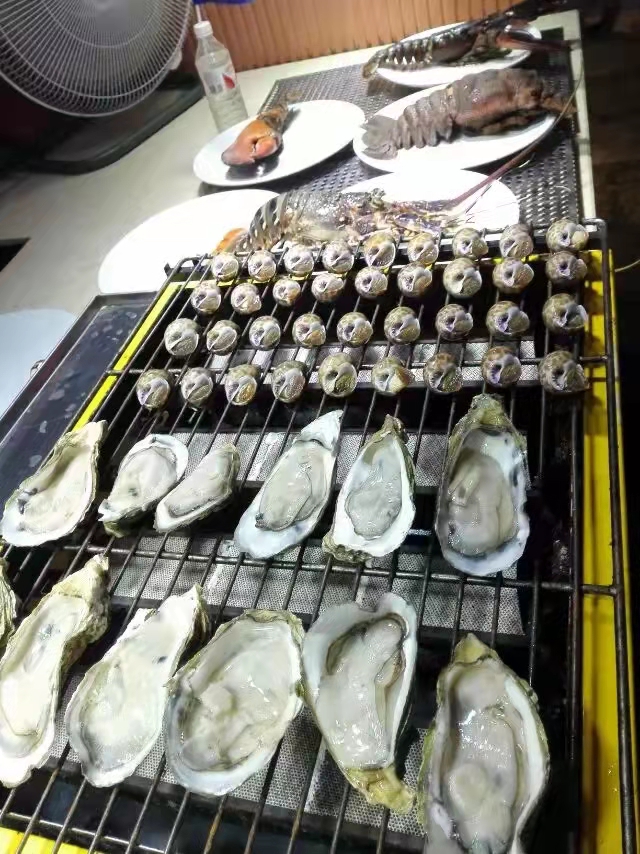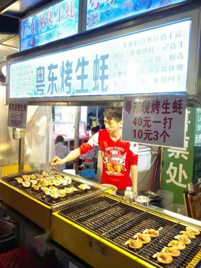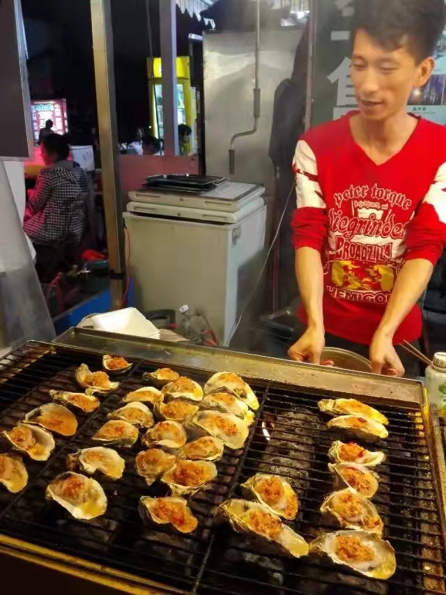 40块钱,一打12个烤生蚝,老板还送一个,40块13个烤生蚝香飘满街。