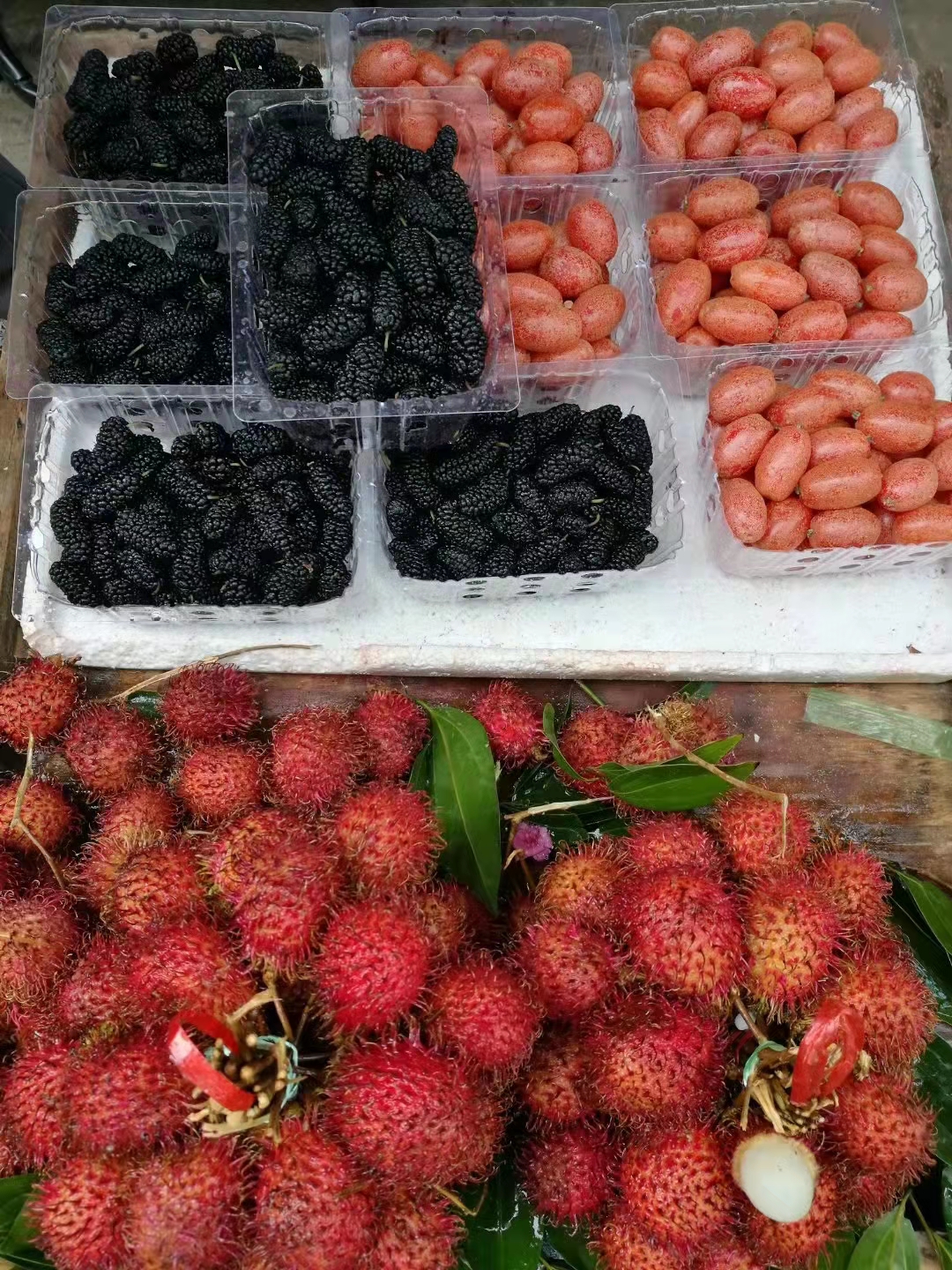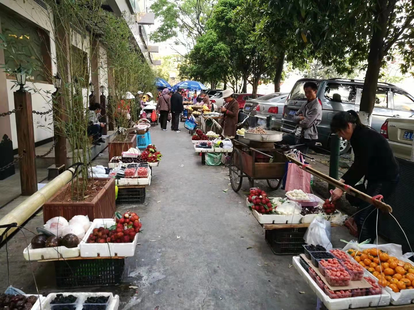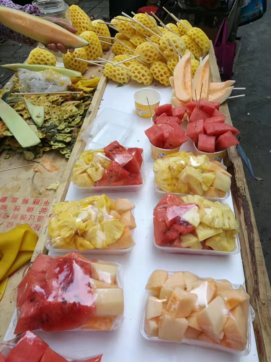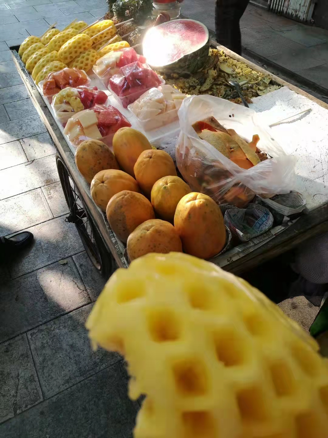 图9,傍晚找到市中心附近菜市场,13元四个大芒果。有史以来各城市里买到性价比最好的芒果,人家负责削好,装袋,正在吃……