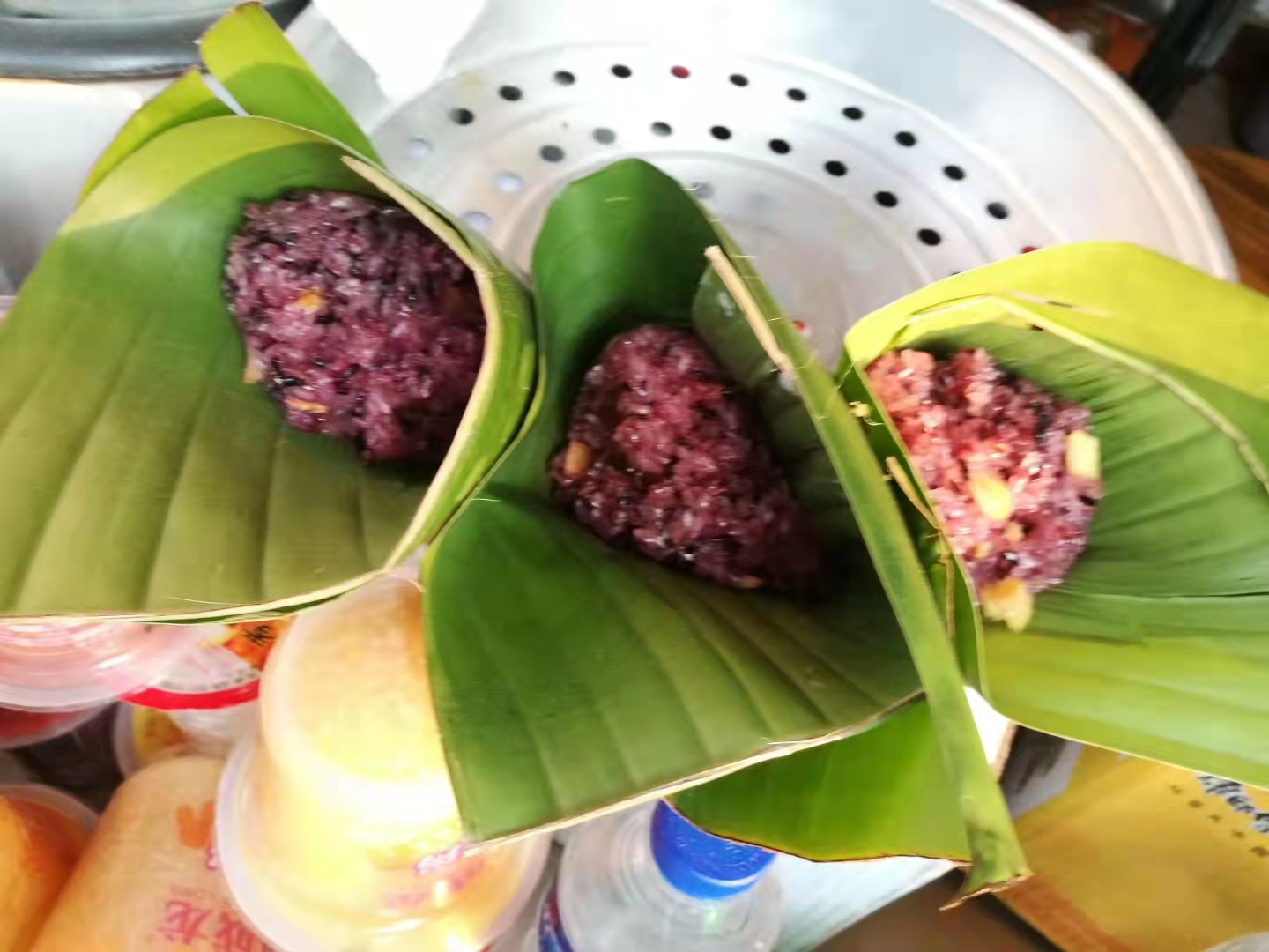 图1起。青叶包裹紫糯米饭,很清香。
