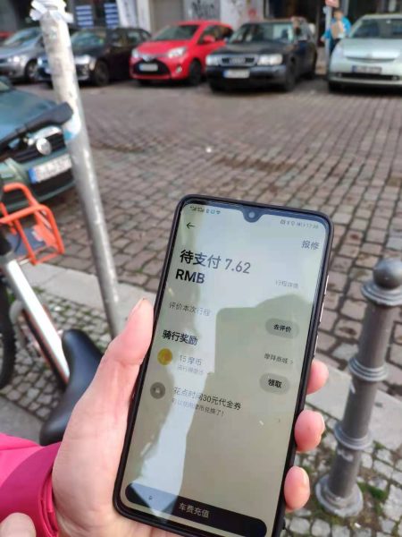 在柏林街上,体验一下伟大祖国的摩拜单车。支付宝骑乘,结算付费都很方便。