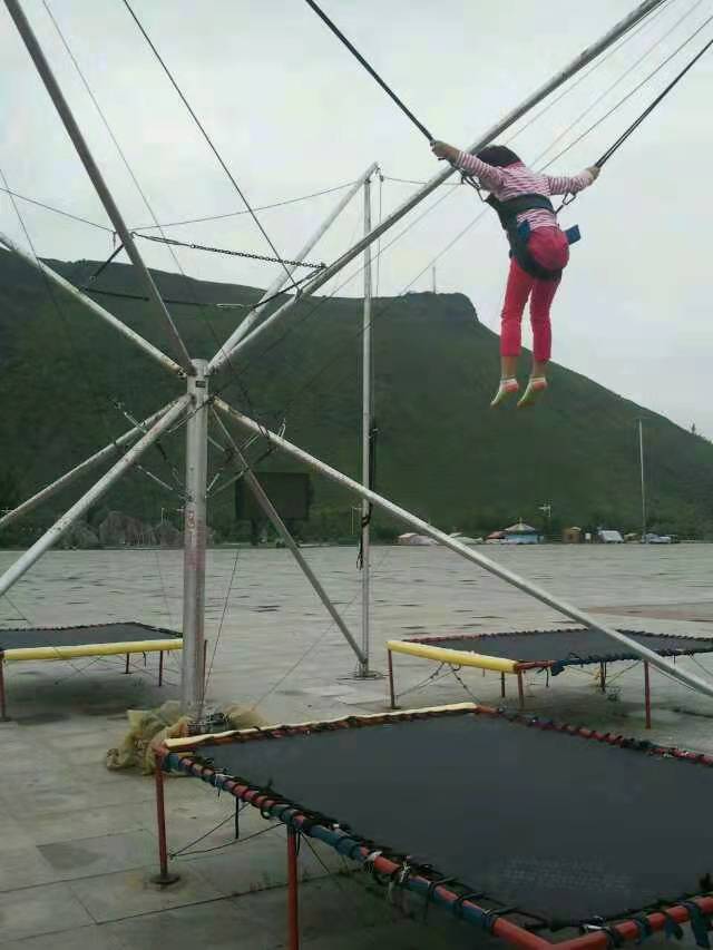 图1图2,室外蹦极,对面是树被砍光了的朝鲜山脉。昨晚宝贝要玩,后来降阵雨没玩成。今天一大早又赶过去了,老板刚起床,就开张了这个生意,嘿嘿。价格,7元10分钟。宝贝10分钟蹦下来,说腿都软了。